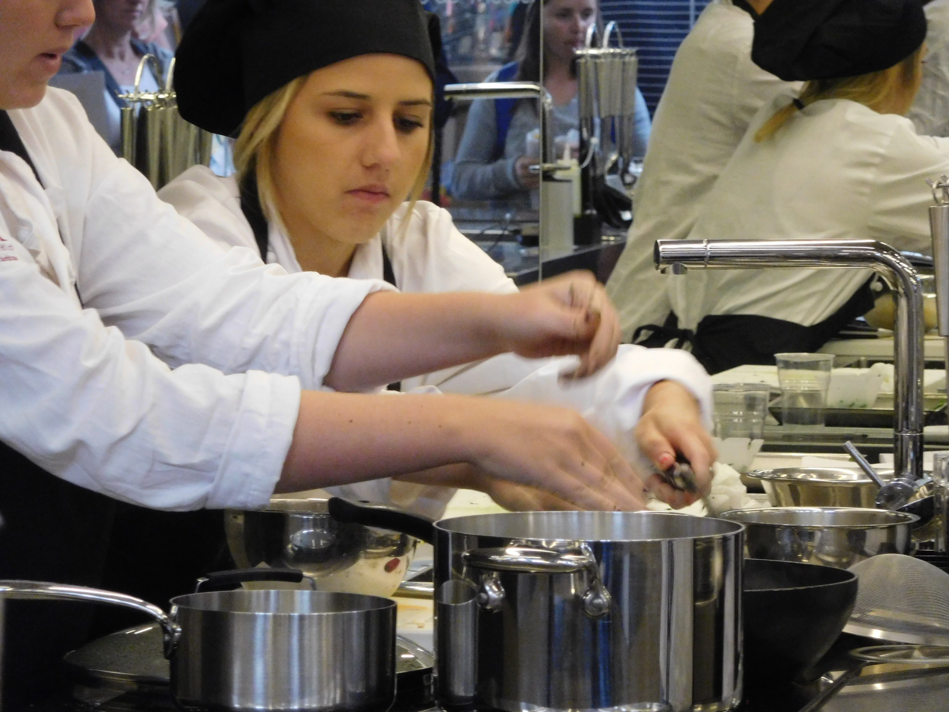 Julia cooking up a storm in her cooking class. Dozens of people watched like you are at an aquarium…including us.